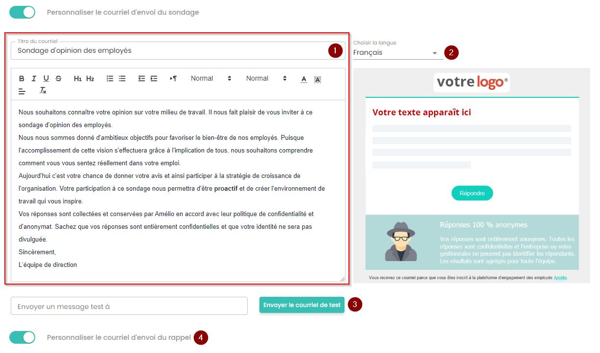 Il est également possible de personnaliser le courriel de rappel que les employés recevront suite à l'envoi du sondage.